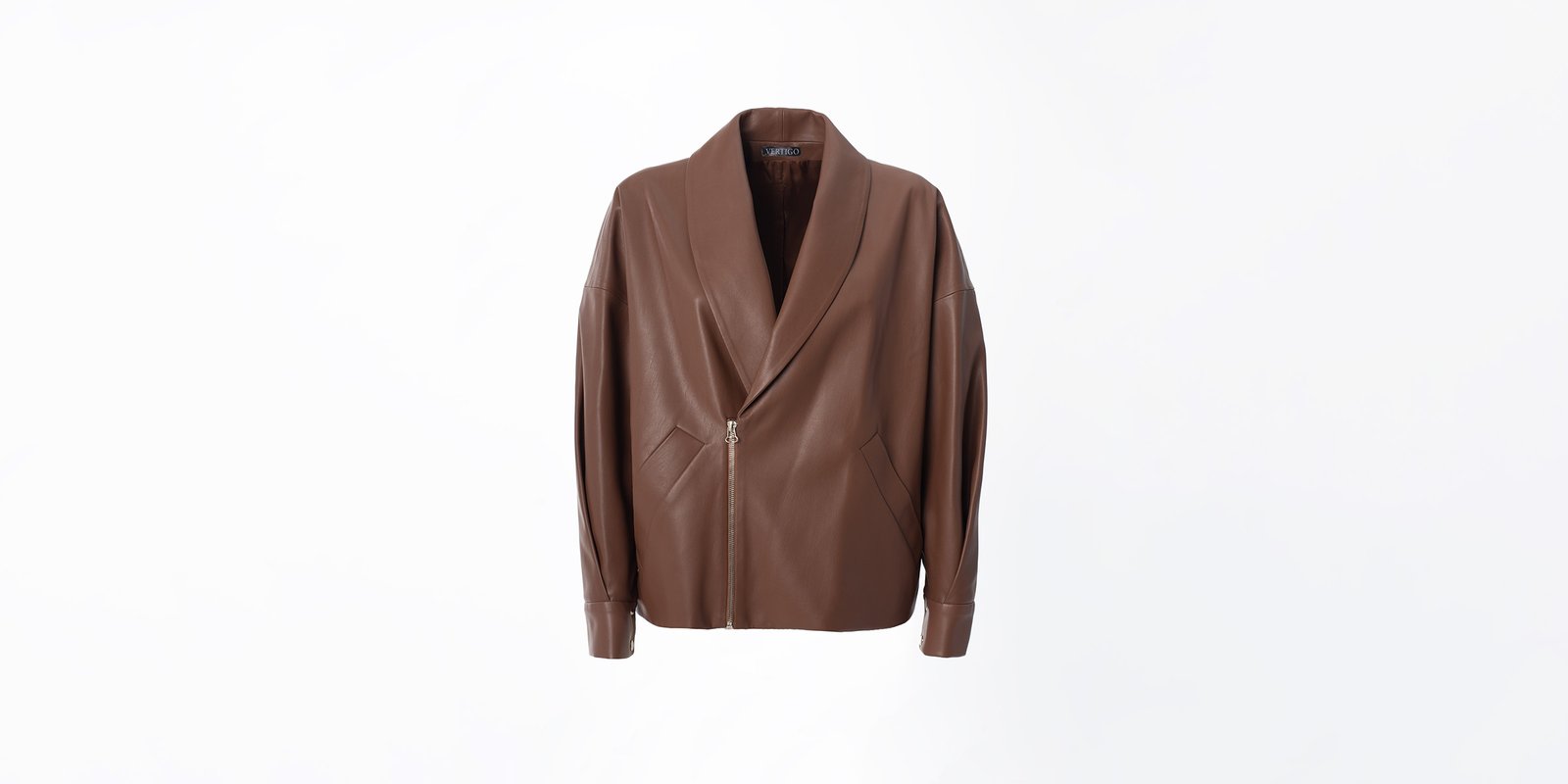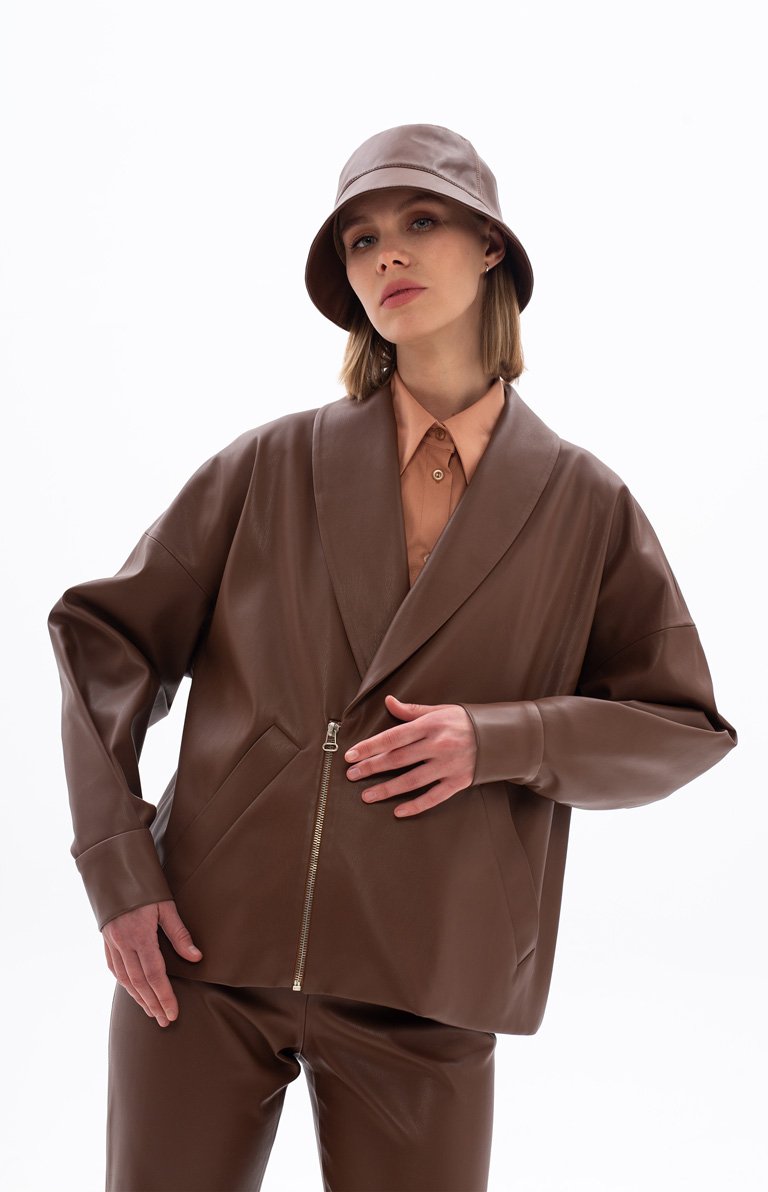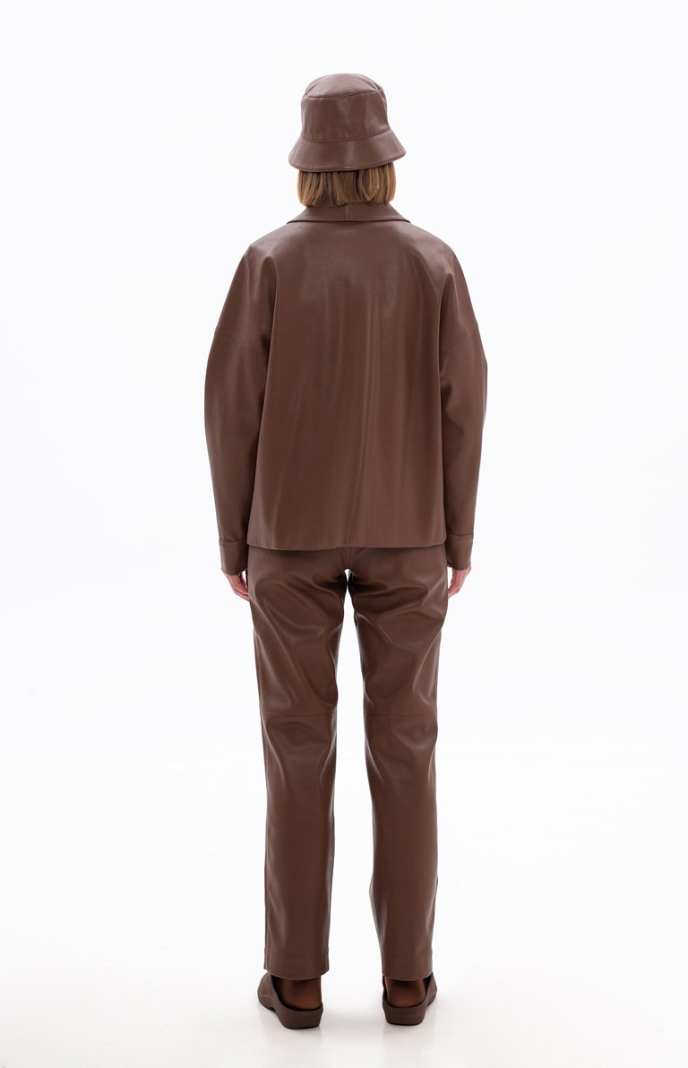 The Chocolate Eco Jacket features a classic silhouette, crafted 100% from eco-leather. The Jacket is designed with a half zip at the front with a branded zipper puller and welt pockets. The shawl-shaped collar gives this jacket a classic yet modern look. The sleeves are designed with a fold sewn at the wrists to add volume and sophisticated draping on the sides.