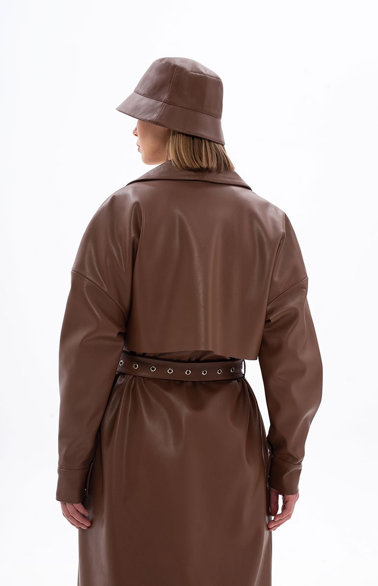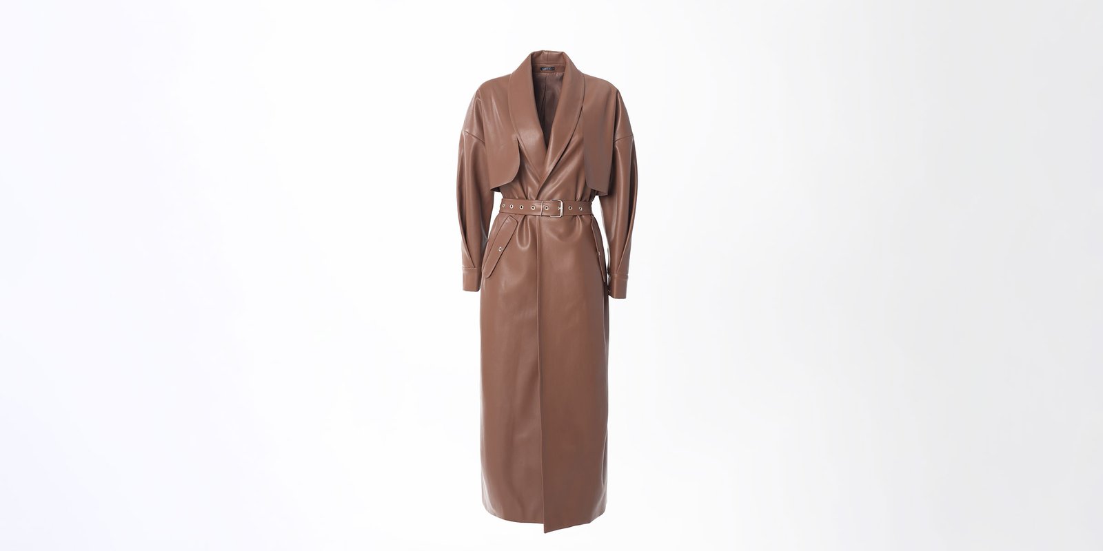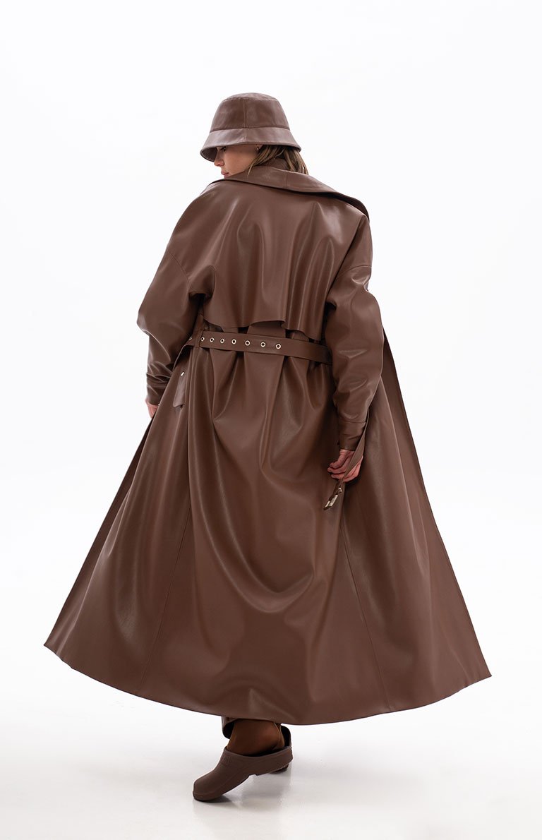 Modern trench coat crafted from eco-leather with an oversized silhouette. The collar is designed with a shawl shape and the waist is accompanied with a leather belt for styling versatility. The sleeves are designed with a fold sewn at the wrists to add volume and sophisticated draping on the sides.