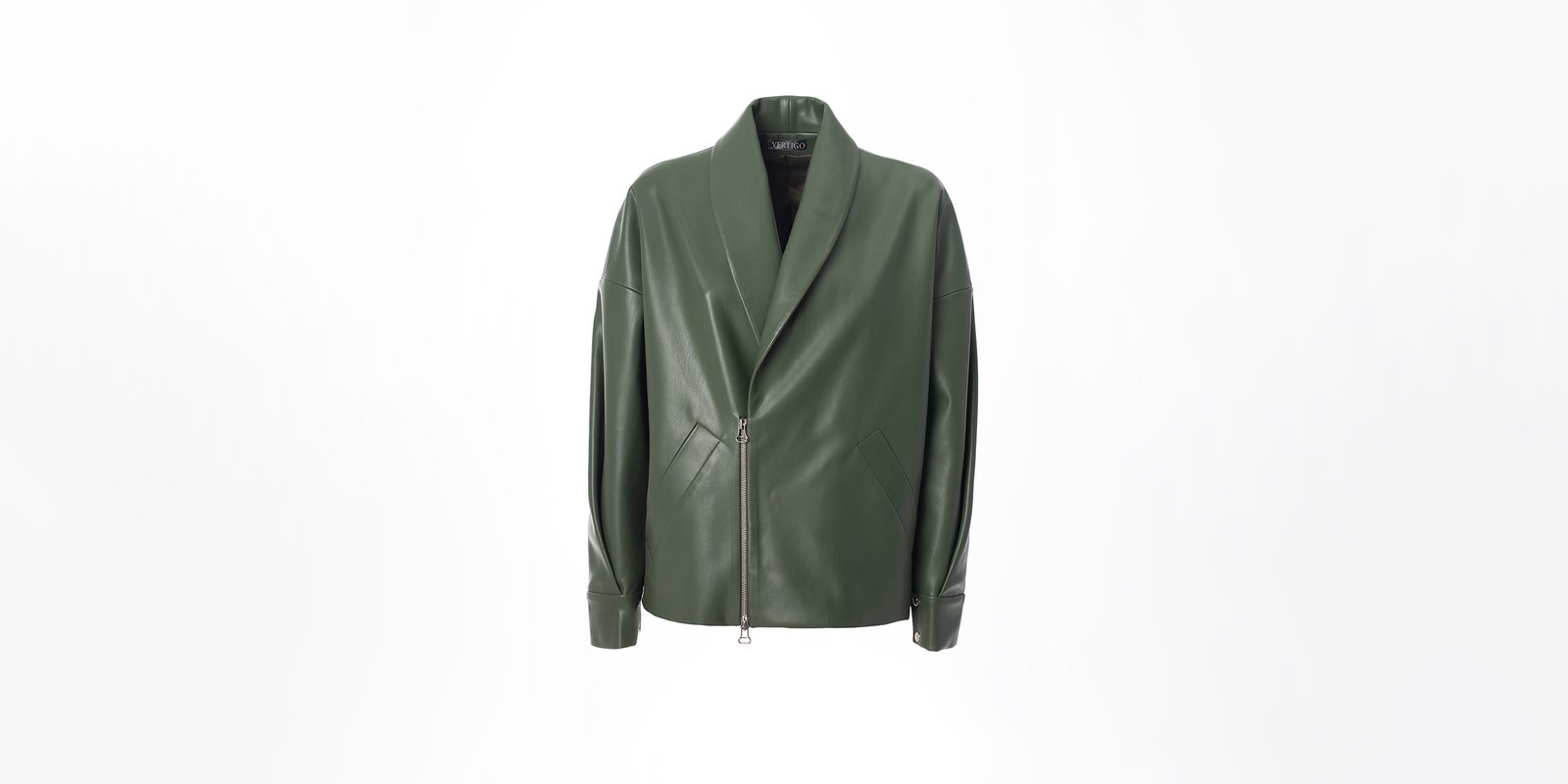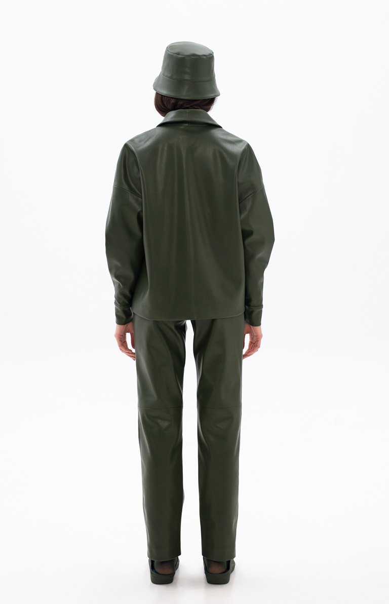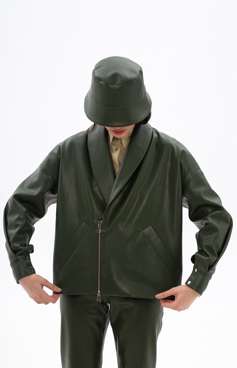 The Raw Green Eco Leather Jacket features a classic silhouette, crafted 100% from eco-leather. The Jacket is designed with a half zip at the front with a branded zipper puller and welt pockets. The shawl-shaped collar gives this jacket a classic yet modern look. The sleeves are designed with a fold sewn at the wrists to add volume and sophisticated draping on the sides.