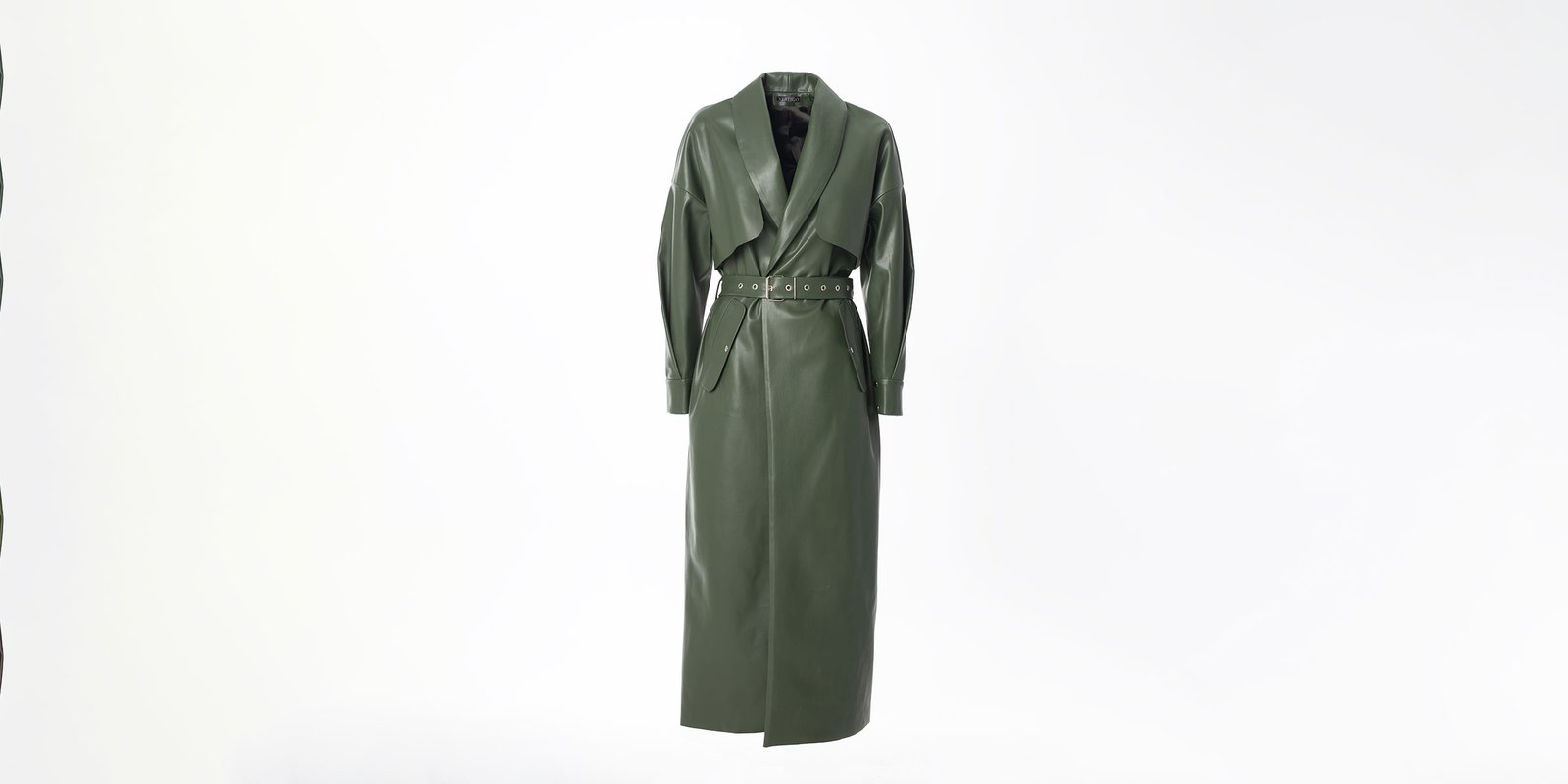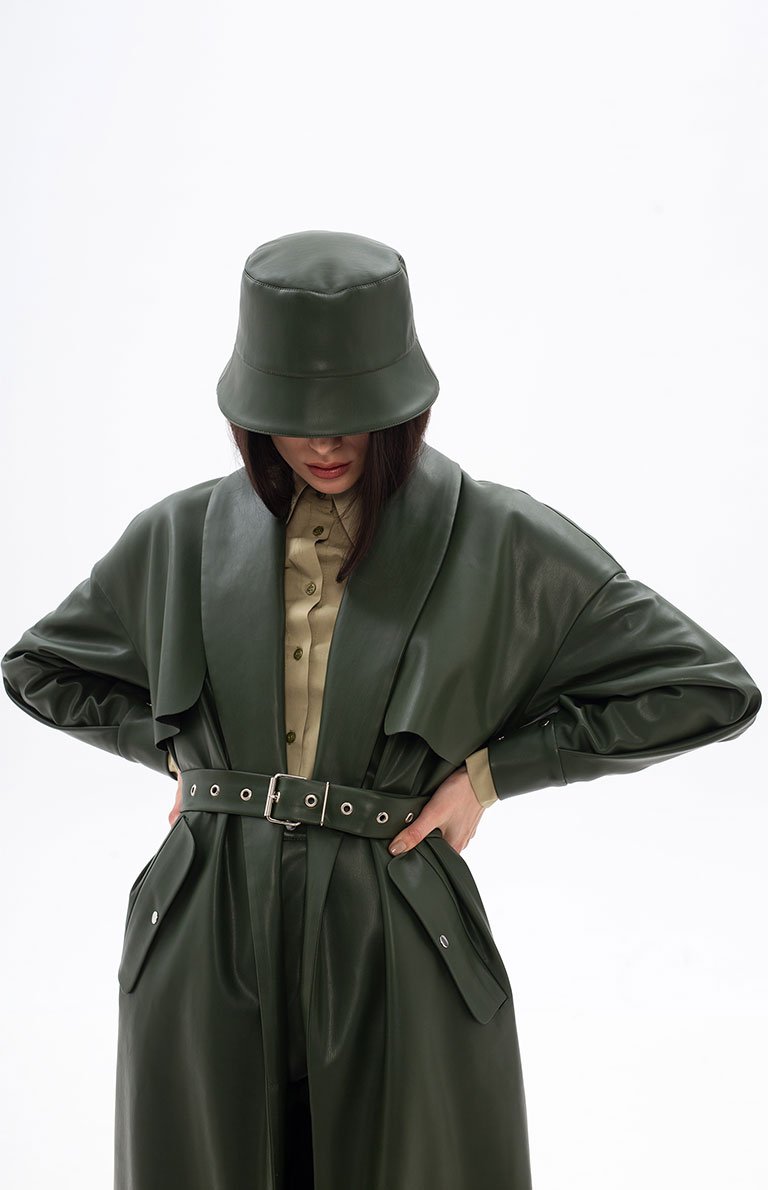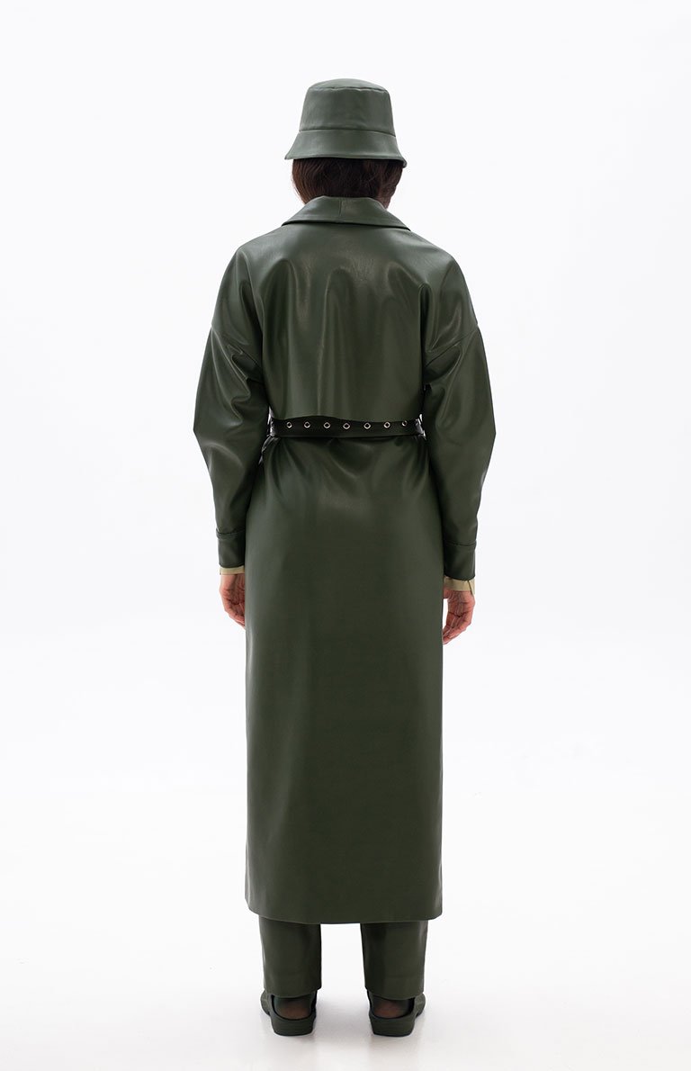 Modern trench coat crafted from eco-leather with an oversized silhouette. The collar is designed with a shawl shape and the waist is accompanied with a leather belt for styling versatility. The sleeves are designed with a fold sewn at the wrists to add volume and sophisticated draping on the sides.